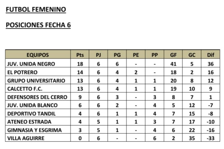A pleno sol se disputó la sexta jornada del Torneo Clausura de Fútbol Femenino, en la cancha del club Independiente. A primera hora las punteras e invictas del Torneo, Juventud Unida Negro, golearon a Calcetto F.C. por 6 a 3 y estiran su ventaja sobre las escoltas. Aquí todo el detalle;
