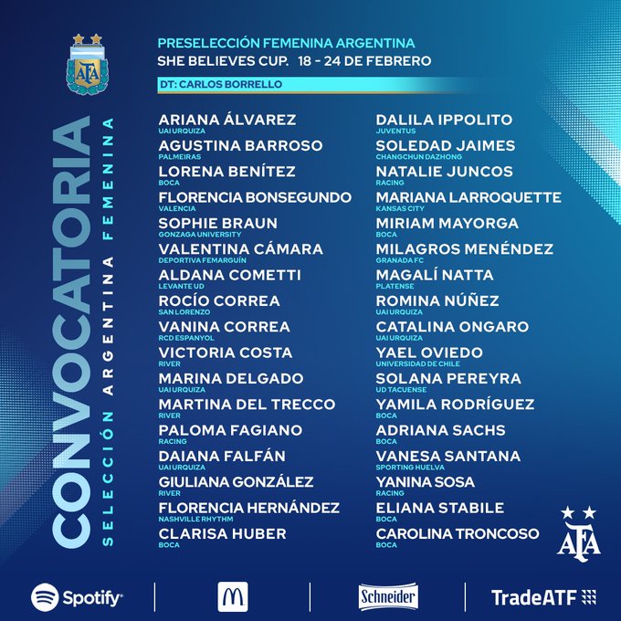 El entrenador del seleccionado argentino femenino de fútbol, Carlos Borrello, realizó este jueves una preselección de 34 jugadoras con vistas a la She Believes Cup, uno de los torneos amistosos de mayor jerarquía en Orlando, Estados Unidos, donde Argentina participará por primera vez en reemplazo de Japón.