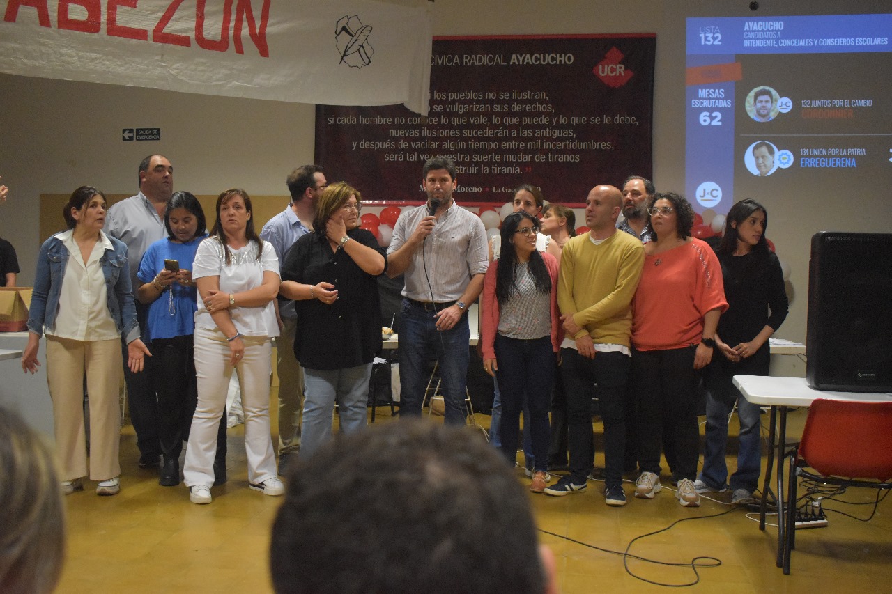 El intendente municipal Lic. Emilio Cordonnier sostuvo; «En primer lugar queremos agradecer al pueblo de Ayacucho, felicitar a todos por el comportamiento que demostró hoy, una vez más ha sido una jornada cívica ejemplar y de esa manera cada uno pudo expresar su voluntad y elegir el rumbo que cada uno quería. El futuro que se desea para la ciudad nos vuelve a tener como protagonistas. Claramente, se eligió esta propuesta, y es un orgullo porque apuesta a la educación y al trabajo como hablamos durante toda la campa, que es la que no se compra y no se vende. Quiero agradecerle a todas las fuerzas que componen el acuerdo cívico, que acompañan a la UCR y en nombre del presidente «cape», que nos muestra un partido abierto para hacer historia. Al PRO; al MUPA nuestro reconocimiento y a toda la gente que aporta, colabora y es parte del Acuerdo. Quiero agradecer a los funcionarios, a mis compañeros de todos los días, a los que hacemos una transformación constante desde hace 12 años, con condiciones de desarrollo y productividad. mencionar a los concejales y consejeros escolares actuales, y a todos los que de una u otra manera aportan su granito de arena. Sabemos que hay cosas por mejorar y corregir, pero sabemos que hay muchas cosas que están bien. Quiero finalmente, agradecer a la lista a los que se han involucrado, han puesto esfuerzo, a la gente nueva que se suma con una mirada critica que nos permite mejorar. Esto no termina hoy, sino que empieza, tenemos que seguir construyendo entre todos ese Ayacucho que queremos, tenemos un desafío muy grande por delante.Y dos cosas finales, tengan la tranquilidad que lejos de relajarnos, esta victoria se la devolveremos con mucho más trabajo y compromiso, vamos a honrar esta confianza, estaremos trabajando como el primer día, y en segundo lugar, que este quien este en la provincia o la nación, seguiremos gestionando y trabajando poniendo siempre a Ayacucho en primer lugar. Esto es de todos, a festejarlo y mañana a trabajar como todos los días por un Ayacucho mejor.»