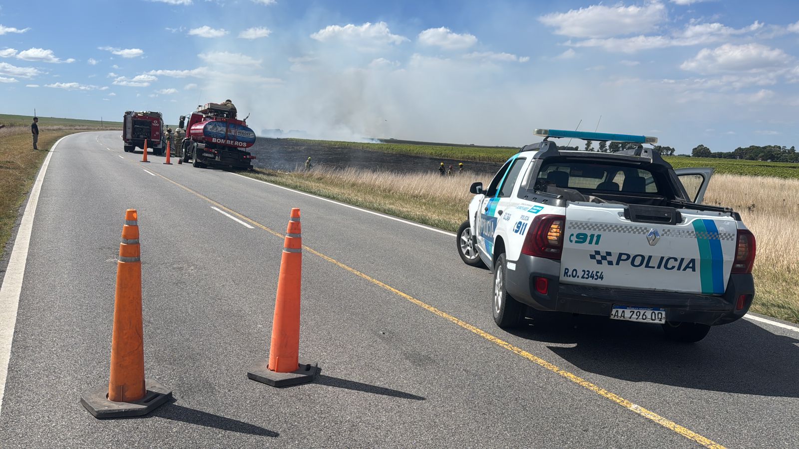 Debido a la magnitud del siniestro, la policía cortó el tránsito de la rotonda de rutas 29 y 74 hacia Balcarce, desviando a los vehículos por Tandil o Las Armas, dado que dimensión del fuego era realmente importante.