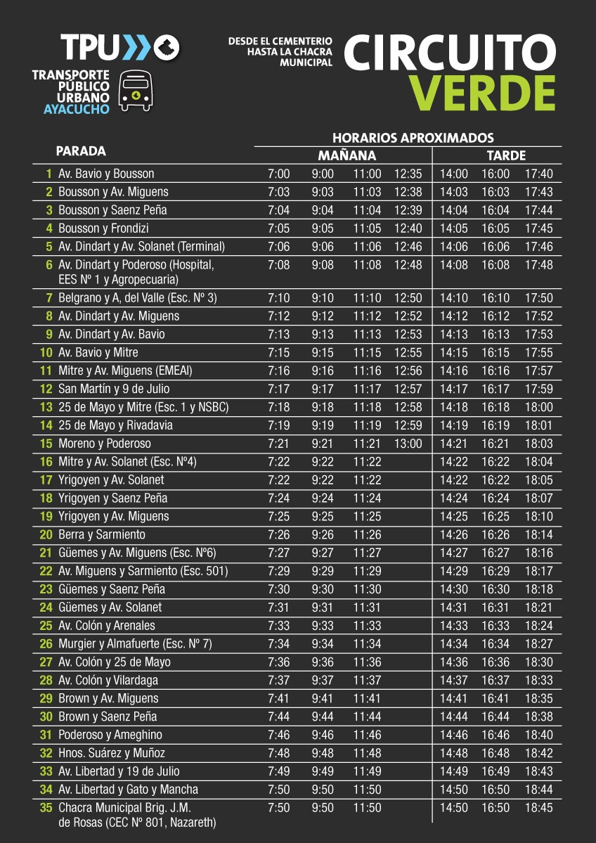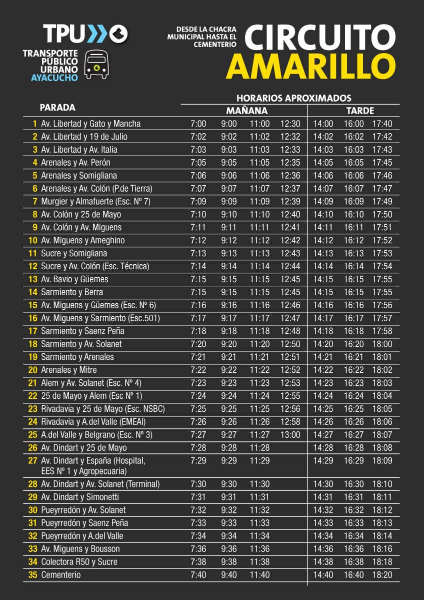 Con dos unidades circulando en horario de mañana, y otra más por la tarde, se mantiene este servicio urbano con cabeceras de inicio y llegada en la Chacra Municipal “Juan Manuel de Rosas” y el Cementerio Municipal, denominados circuito amarillo y circuito verde.