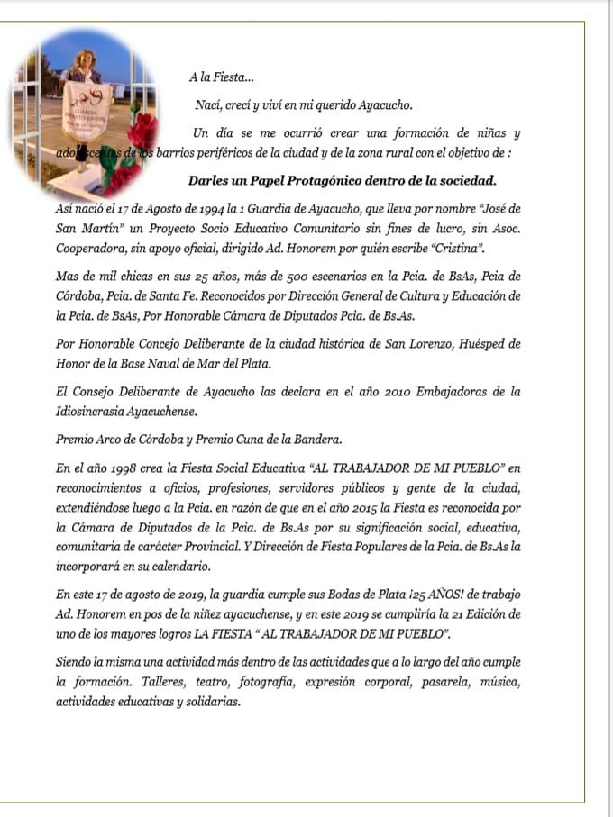 Los años han pasado, las expectativas y el fin siguen siendo el mismo, un Proyecto Social, Participativo y Abierto a todas las personas que quieran sumarse, que se atrevan a ser felices y estén dispuestas a disfrutar de cada momento compartido….Felicitaciones Cris, y a todas las madres, padrinos y allegados que lo hacen posible con su esfuerzo. Orgullo ayacuchense…