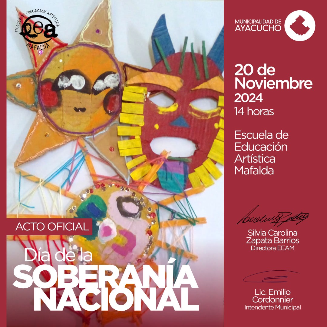 Este miércoles 20 de Noviembre se llevará a cabo el Acto Oficial por el Día de la Soberanía Argentina. El mismo será organizado por la Escuela de Educación Artística “Mafalda” desde las 14 horas.