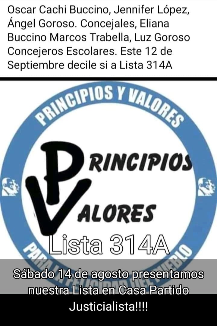 Este sábado 14 de Agosto será presentada la lista, Principios y Valores lista 314A, en la sede del PJ ubicada en 25 de mayo 1366.