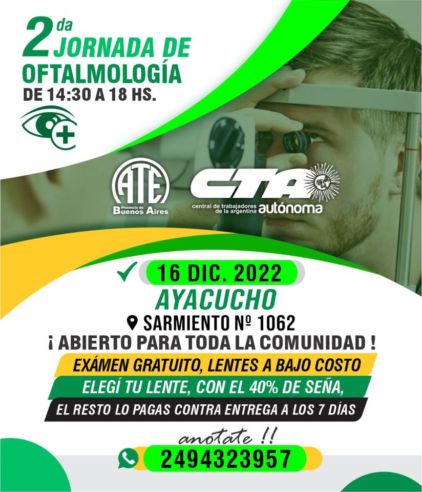 Desde ATE y CTA invitan a la comunidad a la 2° Jornada de Oftalmología, que se concretará hoy viernes 16 de Diciembre, de 14,30 a 18 horas, en la sede del gremio ubicado en Sarmiento 1062.