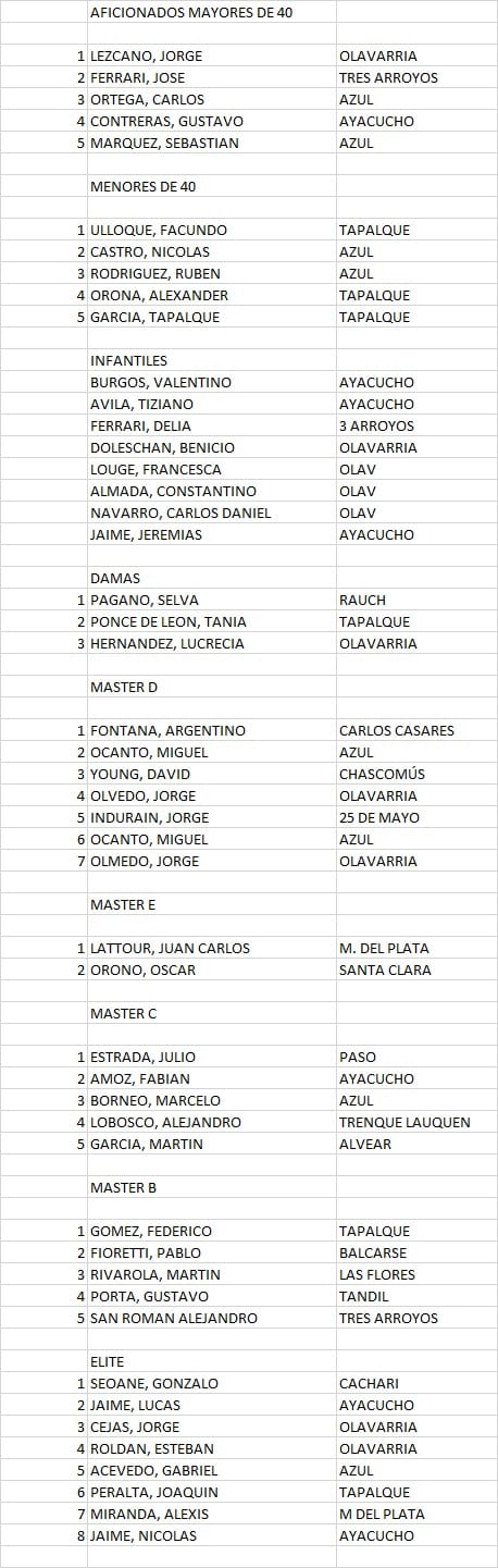 El Club Ciclista Azuleño brindó las siguientes clasificaciones correspondiente al día jueves 20 de Junio, Día de la Bandera;