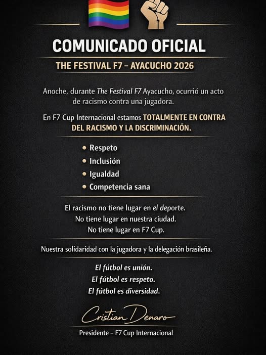 Este domingo pasado, mientras se desarrollaba la final del fútbol femenino del torneo que organizó F7 Cup Internacional en Ayacucho, puntualmente en el Club de Pesca, ocurrió una situación que no podemos aceptar como cotidiana y que fue repudiada desde los 4 costados. Se trató de un insulto con contenido racista hacia una jugadora del equipo brasileño que acababa de patear un shootout (penal).
