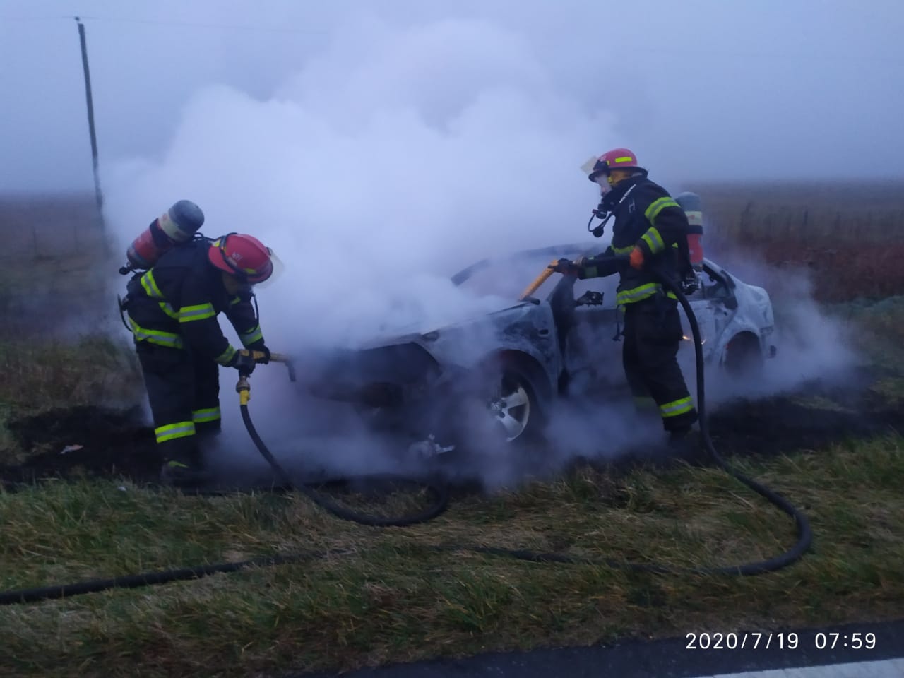 El auto propiedad de Juan Domingo, efectivo de Policía que viajaba a Tandil donde se desempeña, se incendio por completo. El joven efectivo resultó ileso.