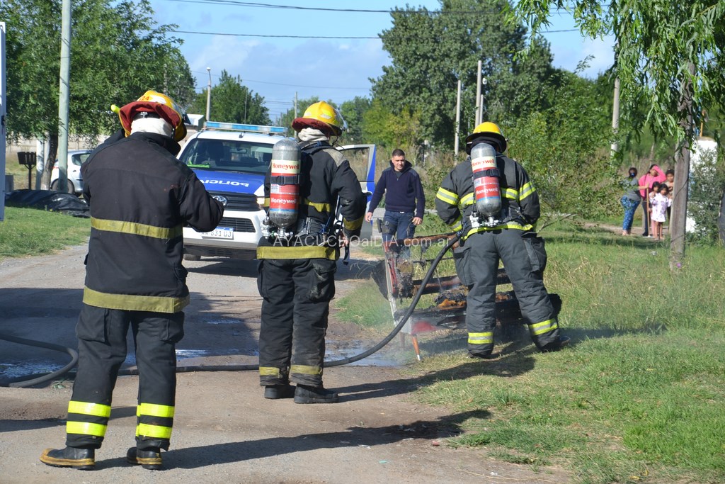 Ayacuchoaldia.com.ar estuvo allí donde al arribar, un vecino, Carlos Matos, con su matafuego había alcanzado a controlar las llamas y poder retirar el sillón a la vereda para que Bomberos no solo terminara de sofocar el siniestro sino también procediera a verificar que no había rastros de temperatura en el interior de la casa.