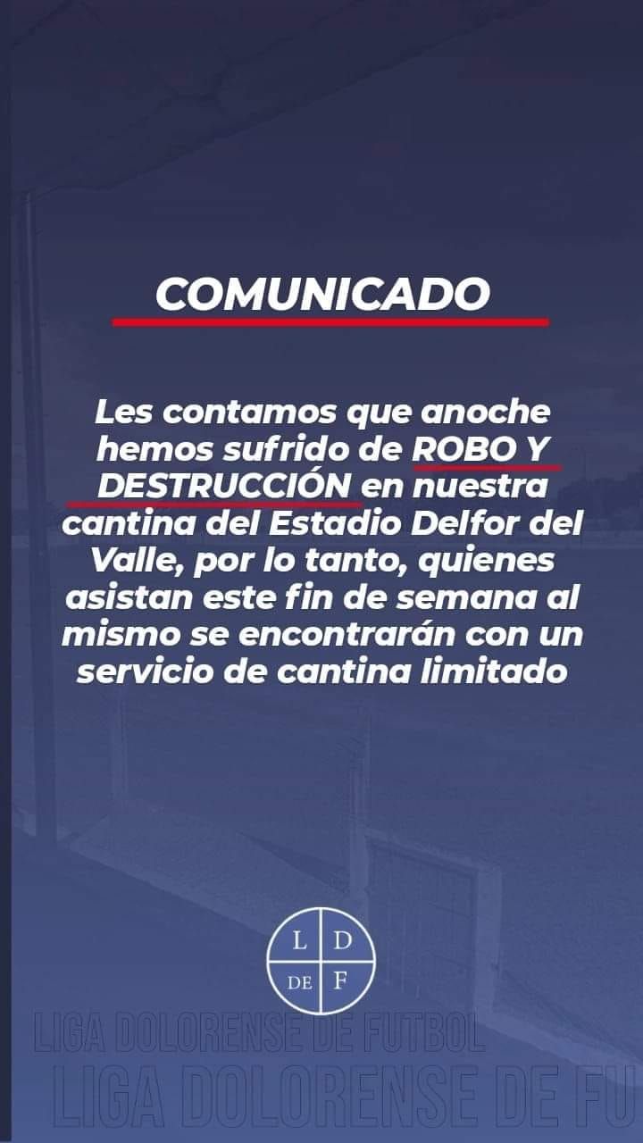 Increíble – Robo y destrozos en el Estadio «Delfor del Valle» de la ciudad de Dolores 24 junio, 2023 Pablo Tusq Deportes, deportes DIA 0 Robo y destrozos y en el estadio «Delfor del Valle» de la ciudad de Dolores. La liga emitió un comunicado; X