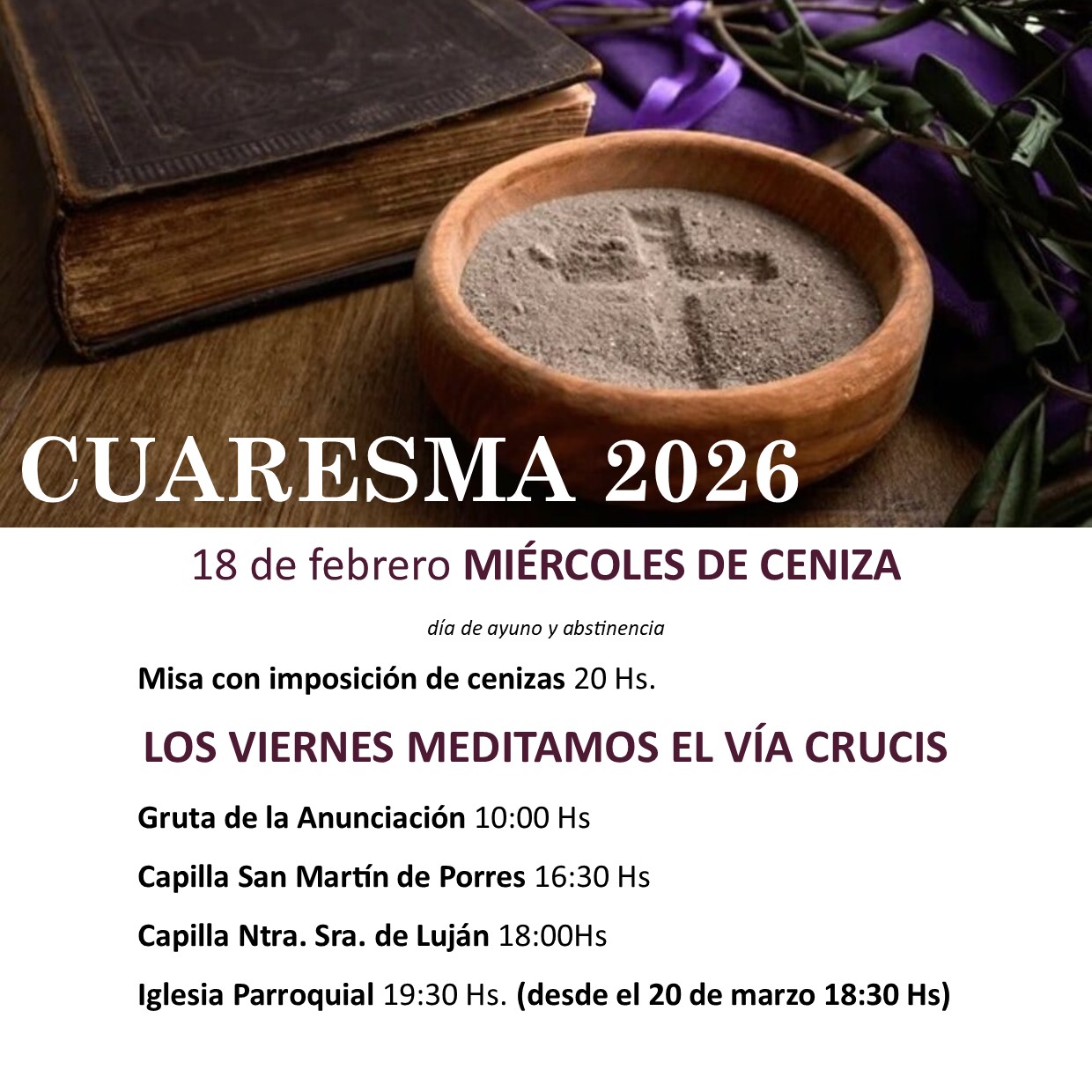 El miércoles 18 de Febrero, terminados los días de carnaval, iniciamos solemnemente el Tiempo de Cuaresma. La Misa de Imposición de las cenizas se realizará a las 20 en la Iglesia Parroquial.