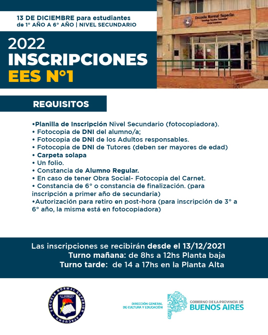 La Escuela de Educación Secundaria Nº1 abrió su inscripción para el ciclo lectivo 2022 para estudiantes de 1º a 6º año del nivel secundario.