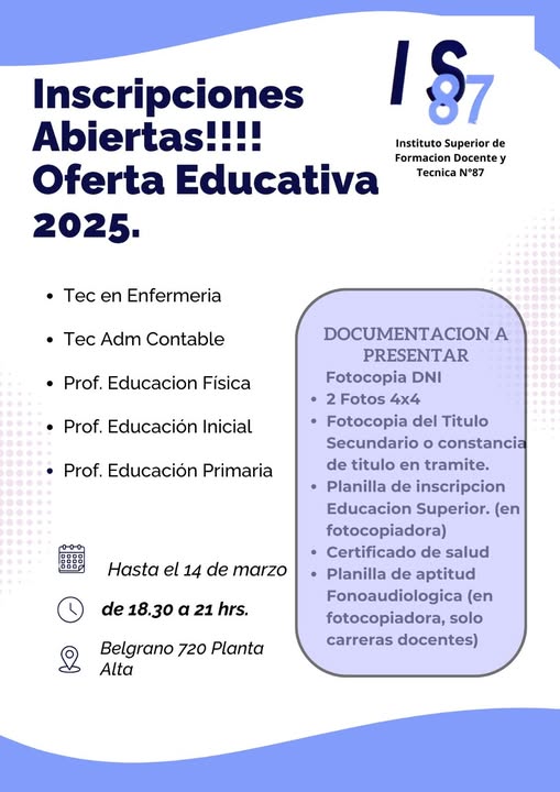 Inscripciones abiertas para las carreras del 2025 en el Instituto 87 26 diciembre, 2024 Redacción destacados, Locales, locales DIA 0 El Instituto Superior de Formación 87 tiene abierta la inscripción para el Ciclo Lectivo 2025, con una interesante cantidad de propuestas pedagógicas. Las mismas se detallan a continuación. X