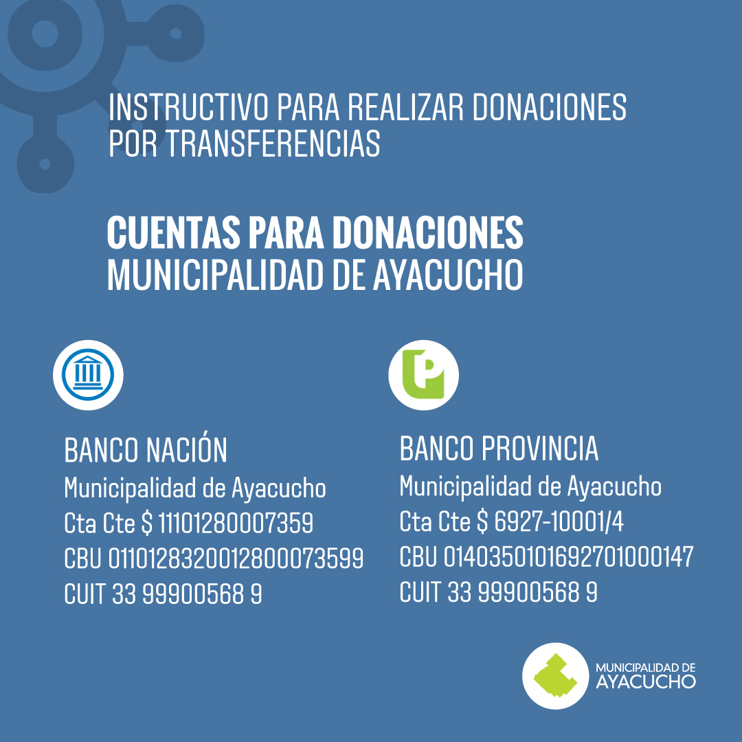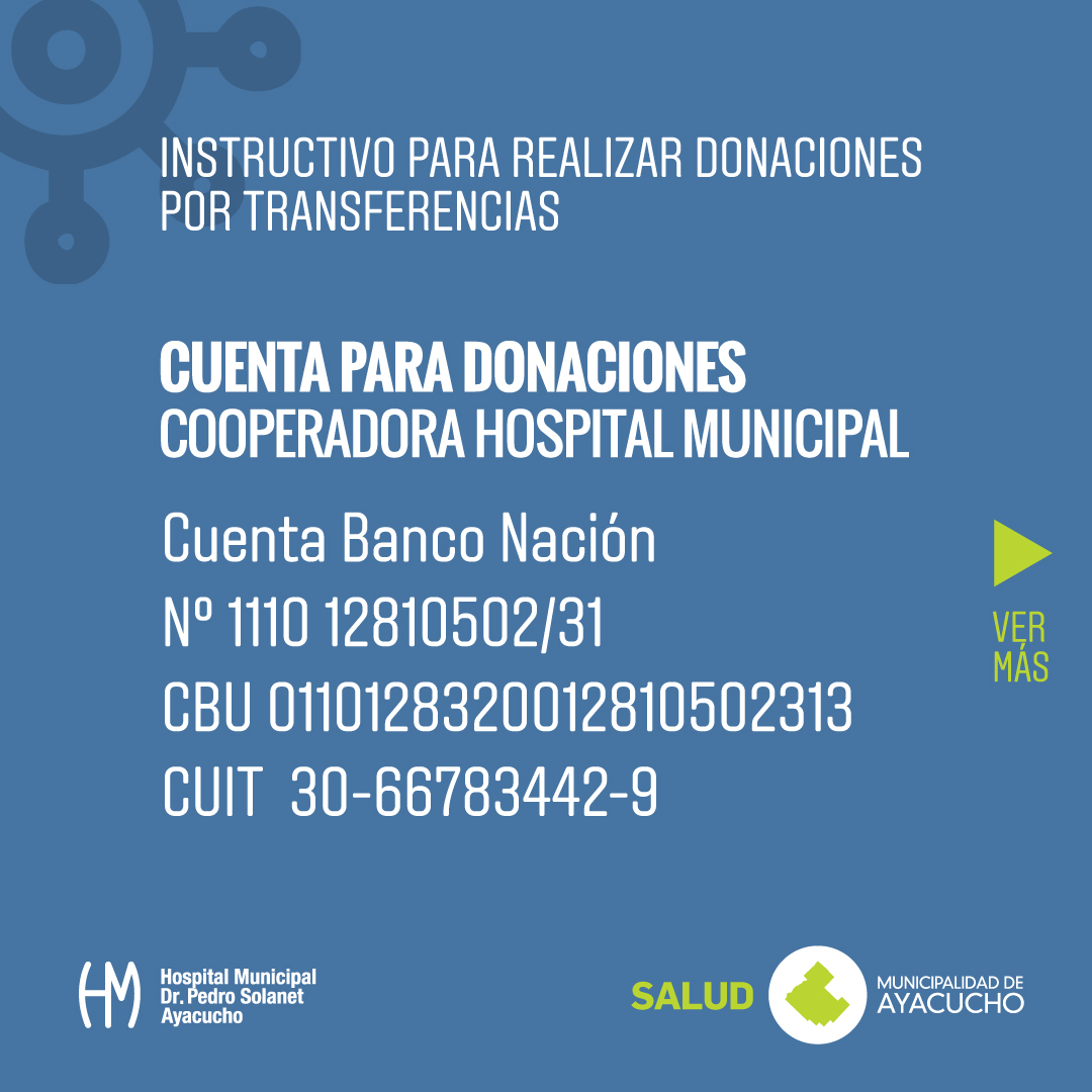 La Municipalidad de Ayacucho hizo público el instructivo para realizar donaciones mediante su cuenta de Banco Nación en medio de esta pandemia, a la Cooperadora del Hospital Municipal «Dr. Pedro Solanet».