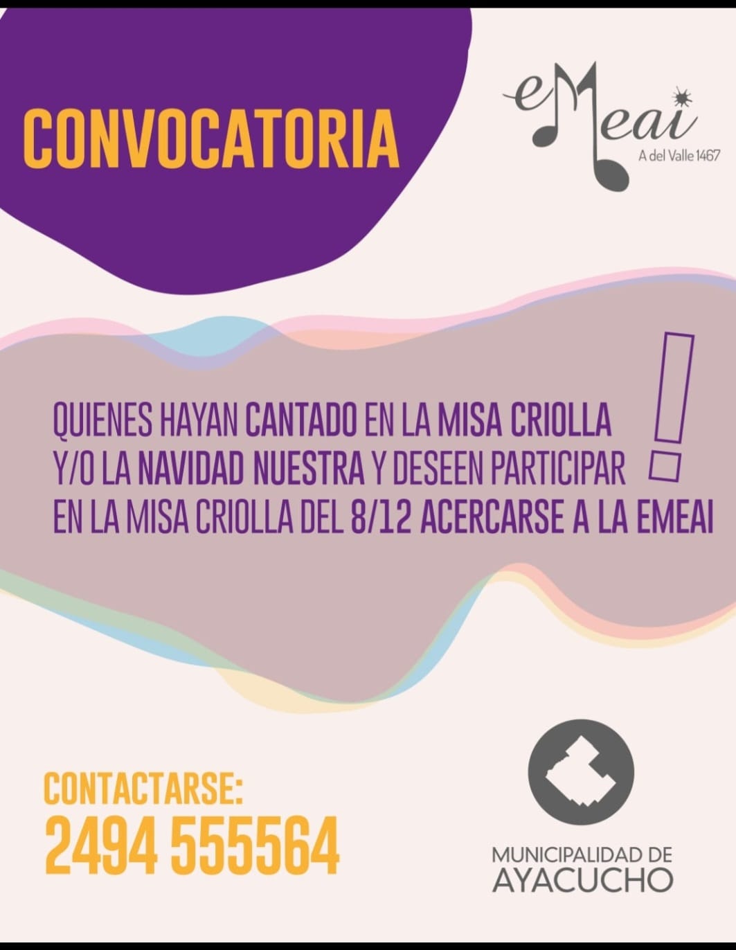 Importante Convocatoria!! No dudes en contactarte al teléfono publicado o pasar por la Escuela Municipal – EMEAI