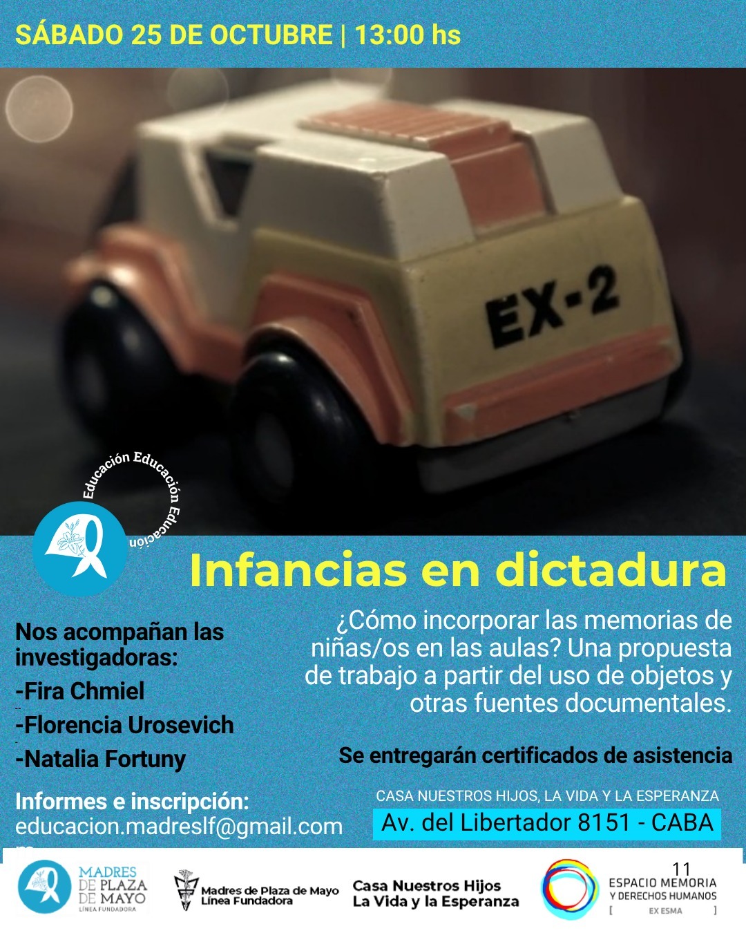 Ese día las especialistas en estudios de las infancias Fira Chmiel, Florencia Urosevich y Natalia Fortuny nos compartirán aportes para pensar acerca del rol y el lugar que tuvieron las/os niñas/os durante la última dictadura militar en Argentina a través de la realización de talleres donde trabajaremos acerca de cómo pensar propuestas didácticas a partir del uso de objetos y otras fuentes documentales/testimoniales.