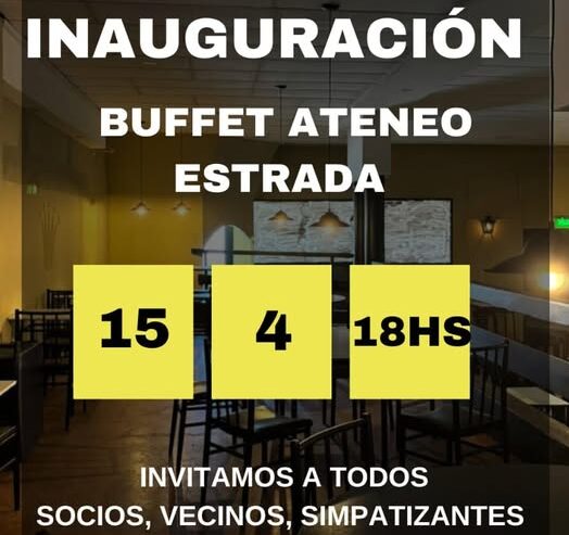 Invitación a la inauguración del Buffet Ateneo Estrada – Miércoles 15 de Abril a las 18 8 abril, 2026 Pablo Tusq Deportes, deportes DIA, destacados 0 ¡Se viene un gran momento para el club! Te invitamos a la **inauguración del Buffet Ateneo Estrada** 15 de Abril 18:00 hs Yrigoyen 1041 Un espacio para compartir, encontrarnos y seguir haciendo crecer nuestro club ¡Están todos invitados! X