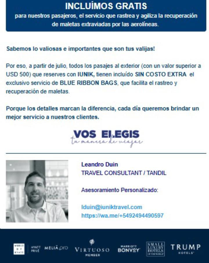 Iunik Travel está en los detalles que hacen la diferencia y por eso, desde el mes de Julio, se incluirá de manera gratuita para todos los pasajeros que viajen al exterior, el exclusivo servicio llamado Blue Ribbon Bags, que tiene como objetivo facilitar el rastreo y recuperación de tus maletas.
