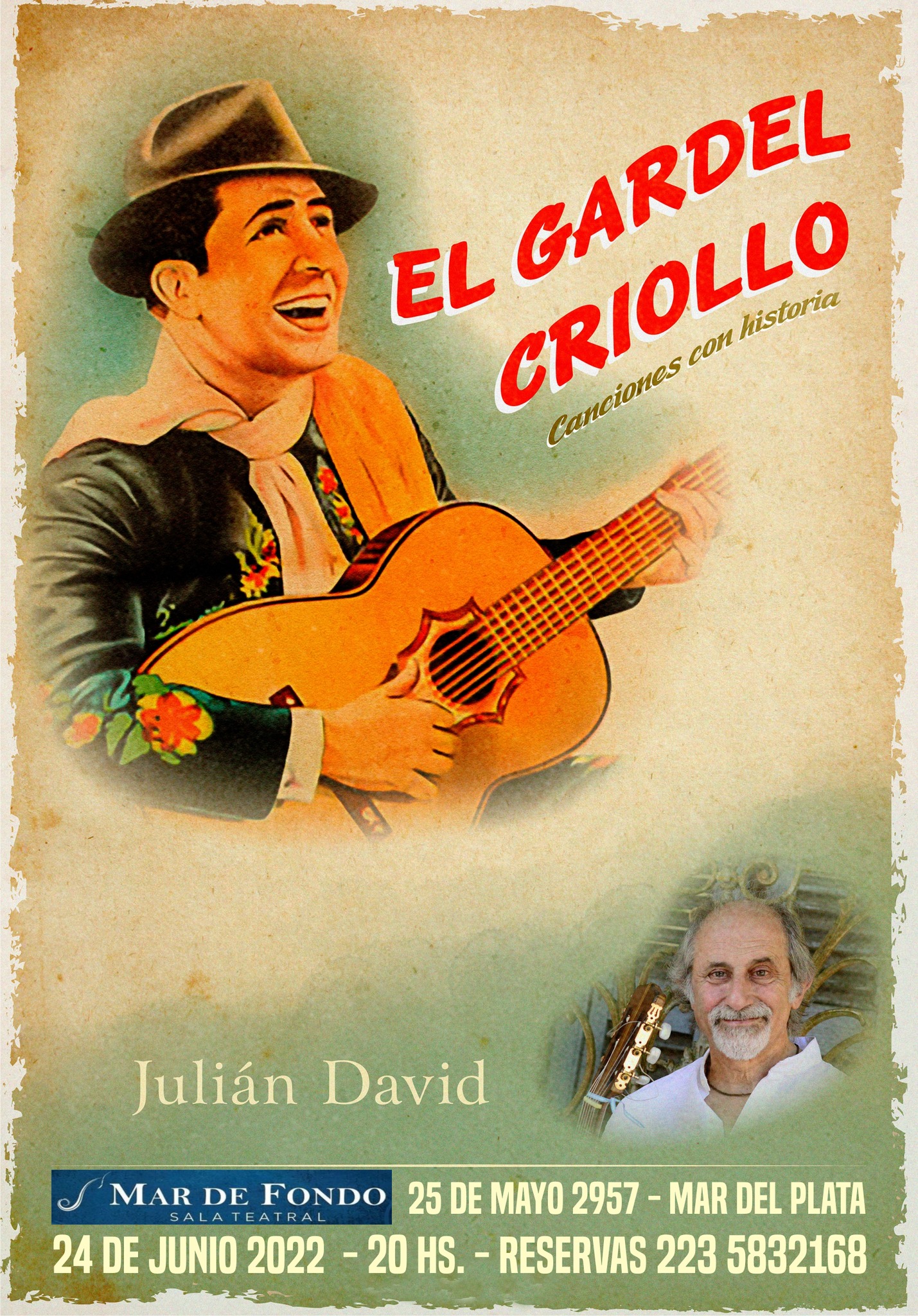 J. D; “Estrené el 30 de enero en el Museo Castagnino de M.d.P. el espectáculo original “El Gardel Criollo” un recital de voz solista y guitarra sobre la primera época de nuestro máximo cantor, con proyección de fotos de Gardel, ilustrado con relatos históricos, musicales y anécdotas, que tuvo elogiosos comentarios. Mis contactos en España ya están reprogramando la presentación y difusión para mi próximo viaje.
