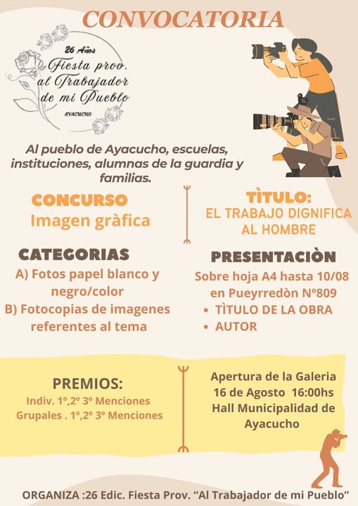 La 26ta Fiesta «Al trabajador de Mí Pueblo» tiene un concurso fotográfico / Participa…. 16 agosto, 2025 Pablo Tusq destacados, Locales, locales DIA 0 X