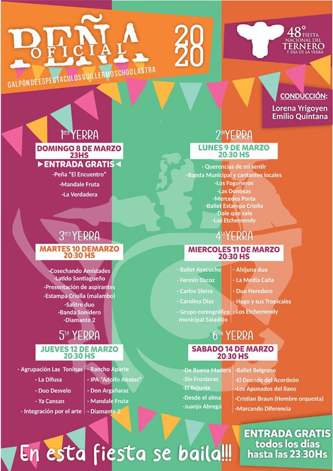 En cuanto al programa en sí, si bien hay detalles por resolver, podemos anunciar que todo comenzará el sábado 29 de febrero, con la presentación de aspirantes. El domingo 8 de marzo habrá una Prueba de Riendas en la Chacra, y se concretará la Declaración del Estado de Yerra en el Club Independiente y por la noche en el Galpón «Guillermo Schoo Lastra», una Peña.