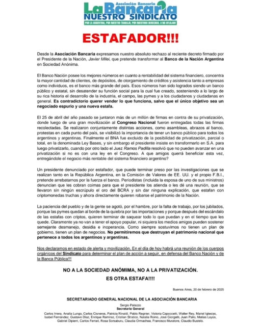 Desde la Asociación Bancaria expresaron su absoluto rechazo al reciente decreto firmado por el Presidente de la Nación, Javier Milei, que busca transformar el Banco de la Nación Argentina en una Sociedad Anónima. Dicho decreto fue rubricado por el propio Jefe de Estado minutos antes de emprender un nuevo viaje a los Estados Unidos este miércoles por la noche.