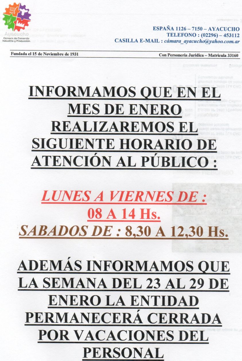 La Cámara de Comercio y su horario de verano – Del 23 al 29 de Enero estará cerrado