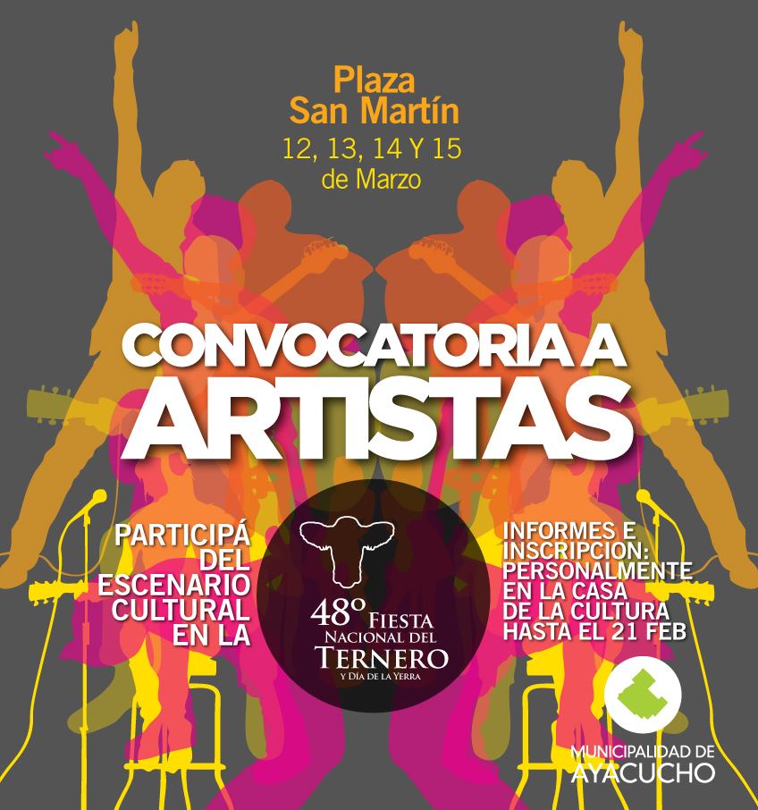 La Dirección de Cultura de la Municipalidad convoca a Artistas que quieran participar del Escenario Cultural que se desarrollará del 12 al 15 de marzo en la Plaza San Martín, en el marco de la 48º Fiesta Nacional del ternero y Día de la Yerra.