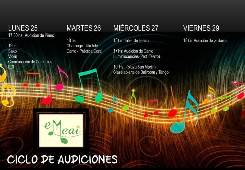 La Escuela Municipal de Enseñanza Artística e Idiomas de nuestra ciudad ya diagramó su agenda del Ciclo de Audiciones finales que se desarrollarán desde hoy lunes 25, y se prolongarán durante toda la semana en las instalaciones de la Escuela, y también una clase abierta en la Plaza San Martín.