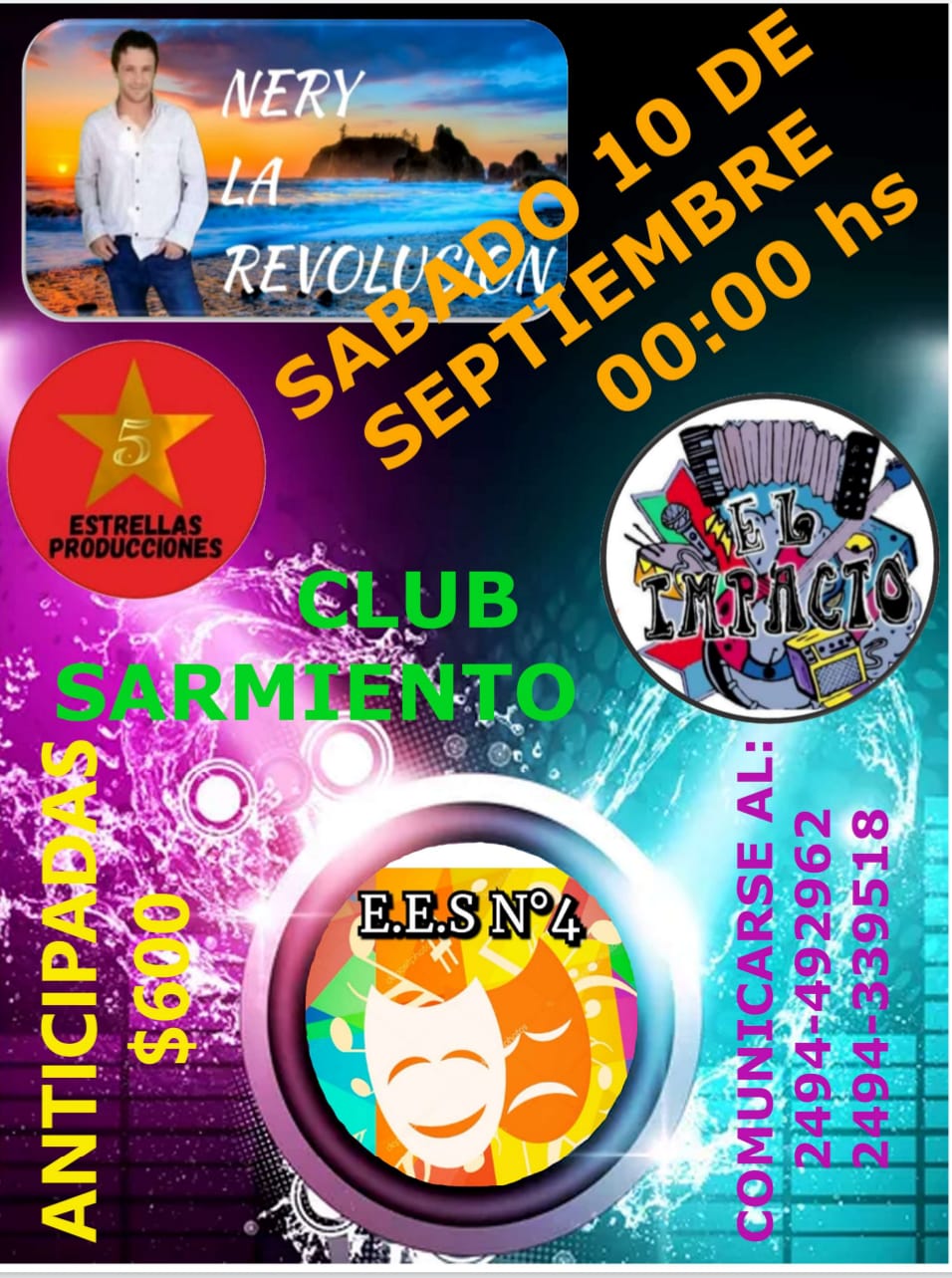 La Escuela de Educación Secundaria N°4 organiza un baile para recaudar fondos para la institución, evento que se llevará a cabo el venidero sábado 10 de Septiembre en las instalaciones del Club Sarmiento. Ya han confirmado su participación El Impacto como también Nery y la Revolución, para bailar y disfrutar a pleno de una linda propuesta.