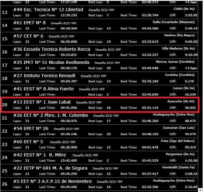 Puesto 20 en el Desafío ECO YPF!!!!. Felicitaciones chicos y docentes, por el compromiso, la responsabilidad y la profesionalidad con que nos representaron. Primera presentación en una competencia de este tipo, sin experiencia pero con muchas ganas. Vamos Ayacucho!!! 20º de 73 escuelas de todo el país. Compartimos la alegría de alumnos, docentes y directivos de la ENET «Juan Labat» Nro 1.