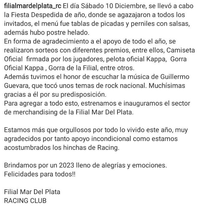 La Filial de Racing Club de Mar del Plata despidió el año con una cena – Fue el pasado sábado 10/12 16 diciembre, 2022 Pablo Tusq Deportes, deportes DIA 0 X