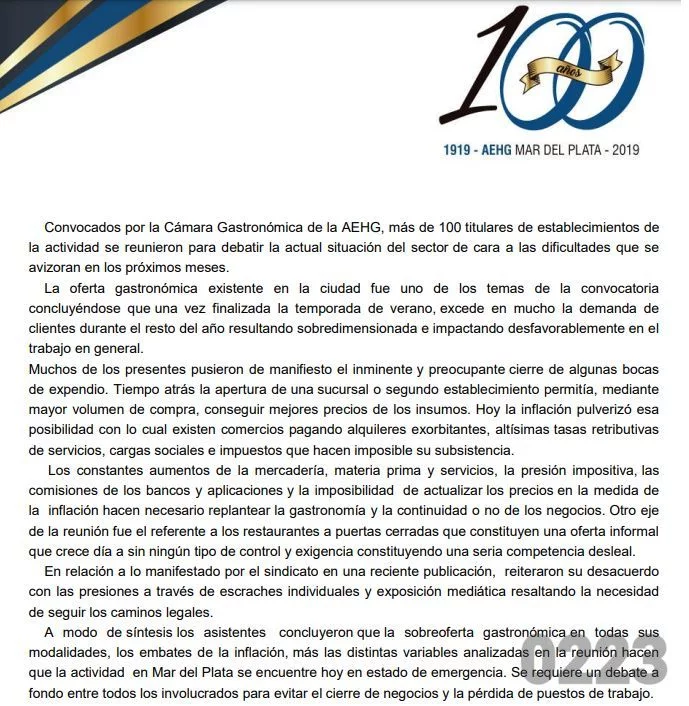 Los integrantes de la Asociación Empresaria Hotelera Gastronómica también apuntaron contra la «competencia desleal» que generan los «restaurantes a puertas cerradas» por constituir una «oferta informal». «Esto crece día a sin ningún tipo de control y exigencia», denunciaron.