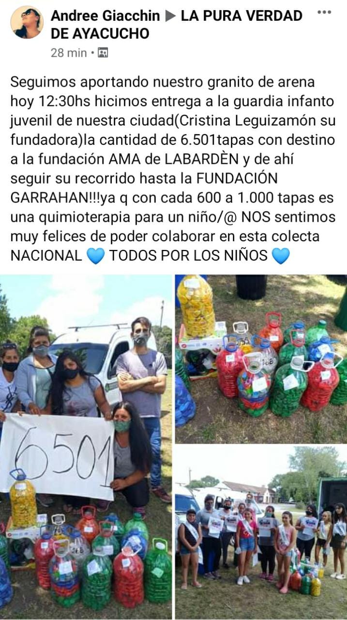 Luego agregó; «La unión hace la fuerza. Las chicas de punto limpio se sumaron a las de la guardia. unidas por el bien común, para ayudar a la fundación Garraham…Bravo !!! Un gran gesto solidario. Y como si fuera poco, el pasado 3 de Febrero con cielo hermoso como testigo, estuvimos en el punto limpio de la Estación y junto a sus 5 operarios, que reunieron 6.501 tapitas para este proyecto, por lo que llegamos a las 15 mil hasta el momento».