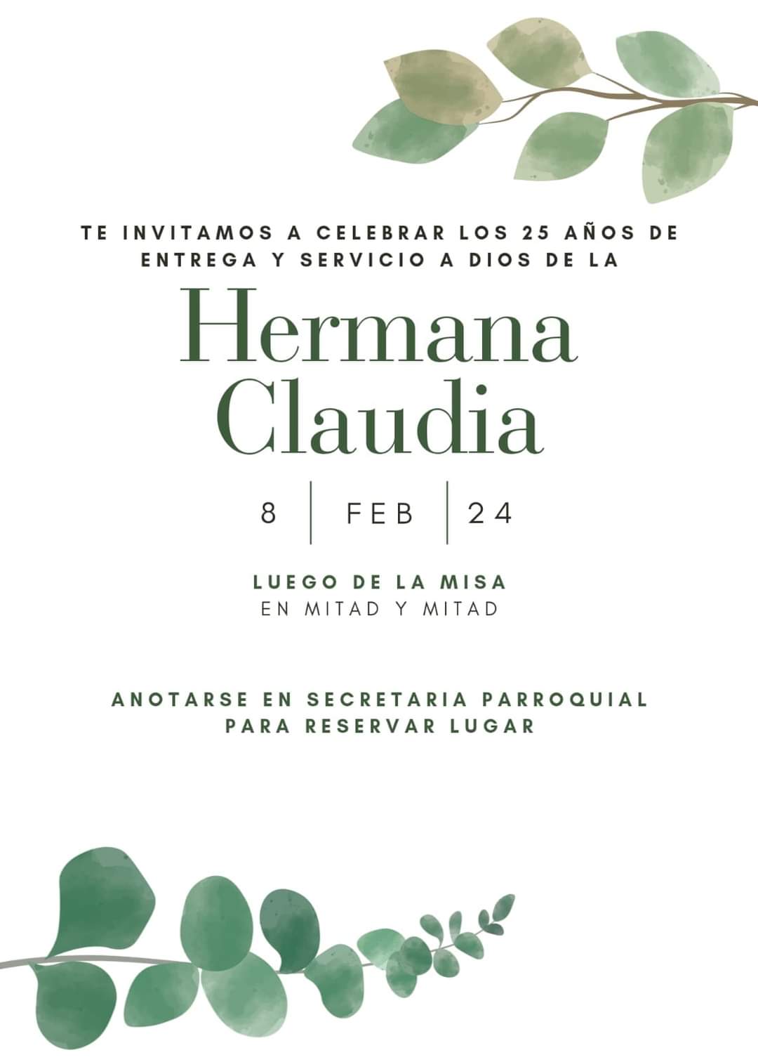La Misa de acción de gracias será este jueves 8 de Febrero a las 20 Hs y el festejo en la Pizzeria «Mitad y Mitad».
