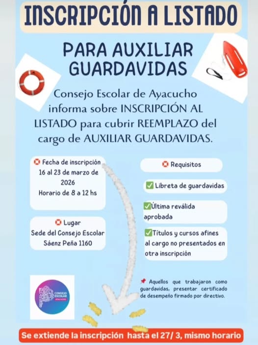 La inscripción al listado para el reemplazo de auxiliar guardavidas se extendió hasta este 27-3 26 marzo, 2026 Pablo Tusq destacados, Locales, locales DIA 0 Se extiende el periodo de inscripción hasta el viernes 27/3 , de 8 a 12 hs X