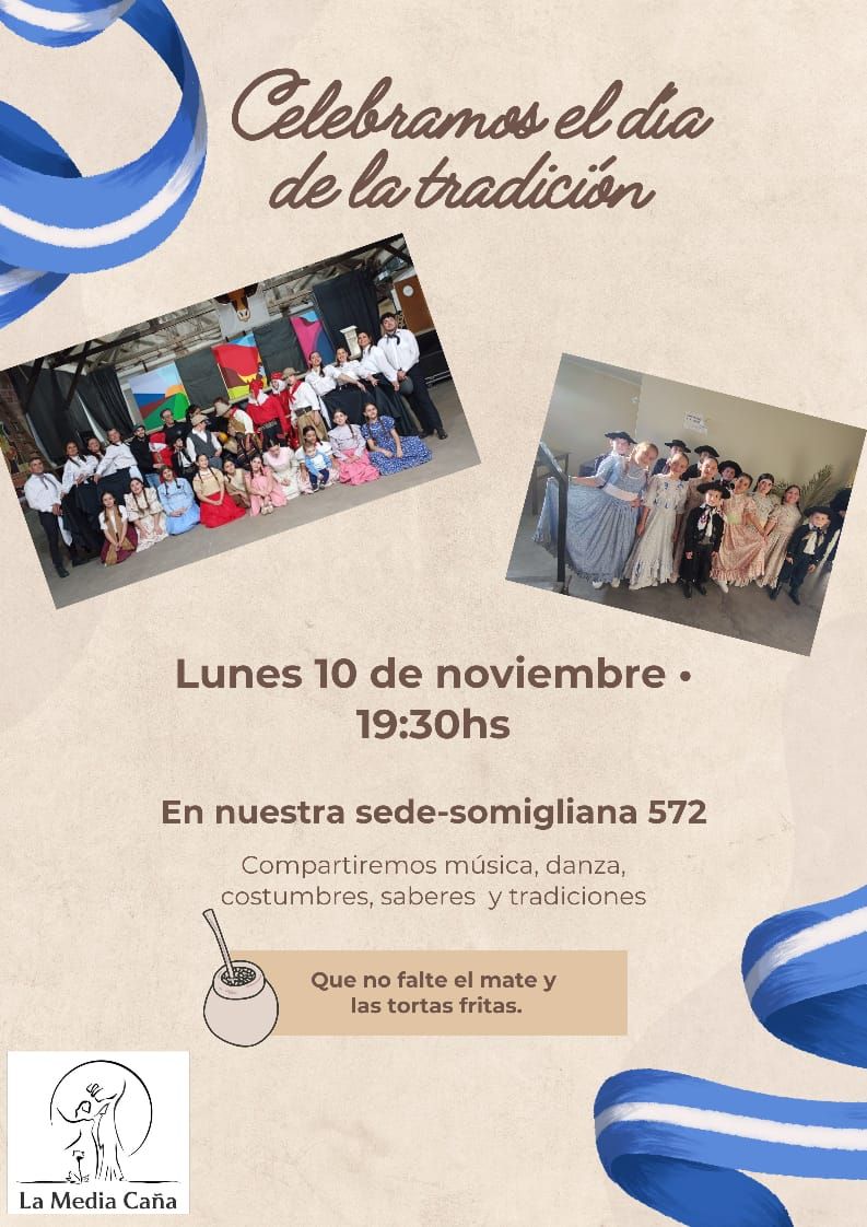 La Academia Folclórica La Media Caña, invita a la comunidad a festejar el Día de la Tradición, hoy lunes 10 de Noviembre a las 19,30 horas en su sede de Somigliana 572. Allí, además, de música y danza como es habitual, se podrá disfrutar y compartir de costumbres, saberes y tradiciones, además de mates y torta fritas.