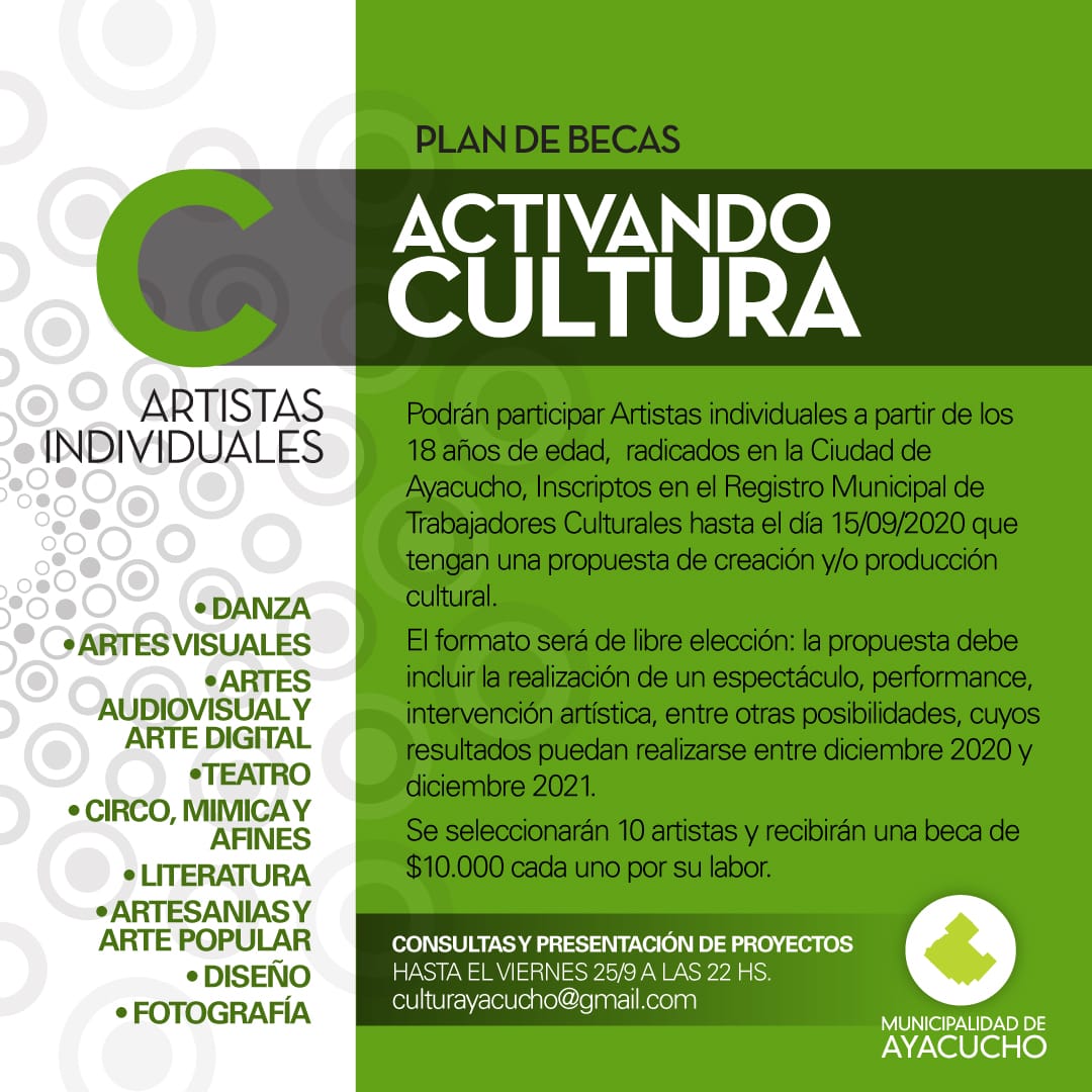 El solicitante deberán inscribirse por mail a culturayacucho@gmail.com con el asunto “Plan Beca “C”, desde el anuncio de la convocatoria hasta el viernes 25/09 a las 22:00 hs.