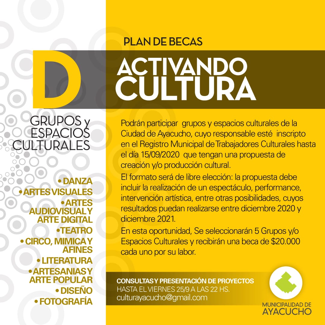 El solicitante deberán inscribirse por mail a culturayacucho@gmail.com con el asunto “Plan Beca “D”, desde el anuncio de la convocatoria hasta el viernes 25/09 a las 22:00 hs.