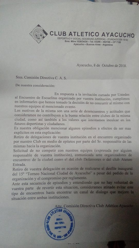 El Club Atlético envió una nota a su par Sarmiento en donde explicó los motivos por los cuales no asistirá al Encuentro de Escuelita que la entidad de 25 de Mayo y Rivadavia iba a concretar este Lunes 15 y que finalmente se postergó. Allí, esgrimió los motivos que la llevaron a tomar la decisión de no acudir a sus eventos hasta tanto se limen las asperezas entre las entidades. Una verdadera pena que no haya lugar para el diálogo y poder subsanar cada uno de los episodios que pudieron haber ocurrido.