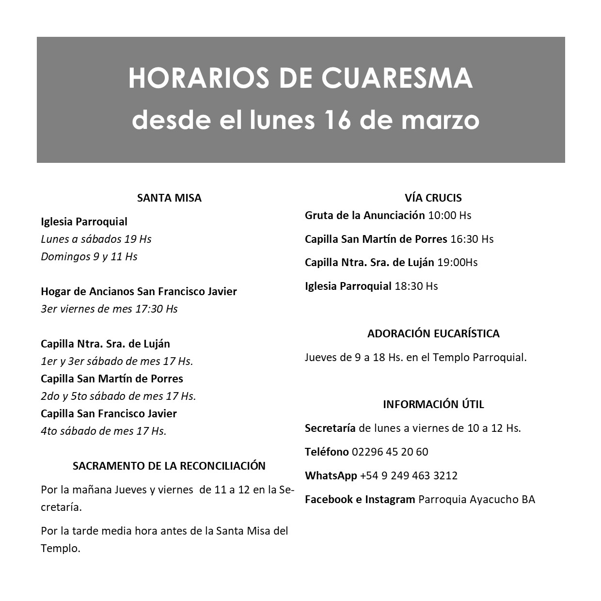 Estimados medios de comunicación; Junto con los deseos de una fecunda Fiesta Nacional del Ternero y Día de la Yerra. Comparto los nuevos horarios de la Parroquia hasta Semana Santa.