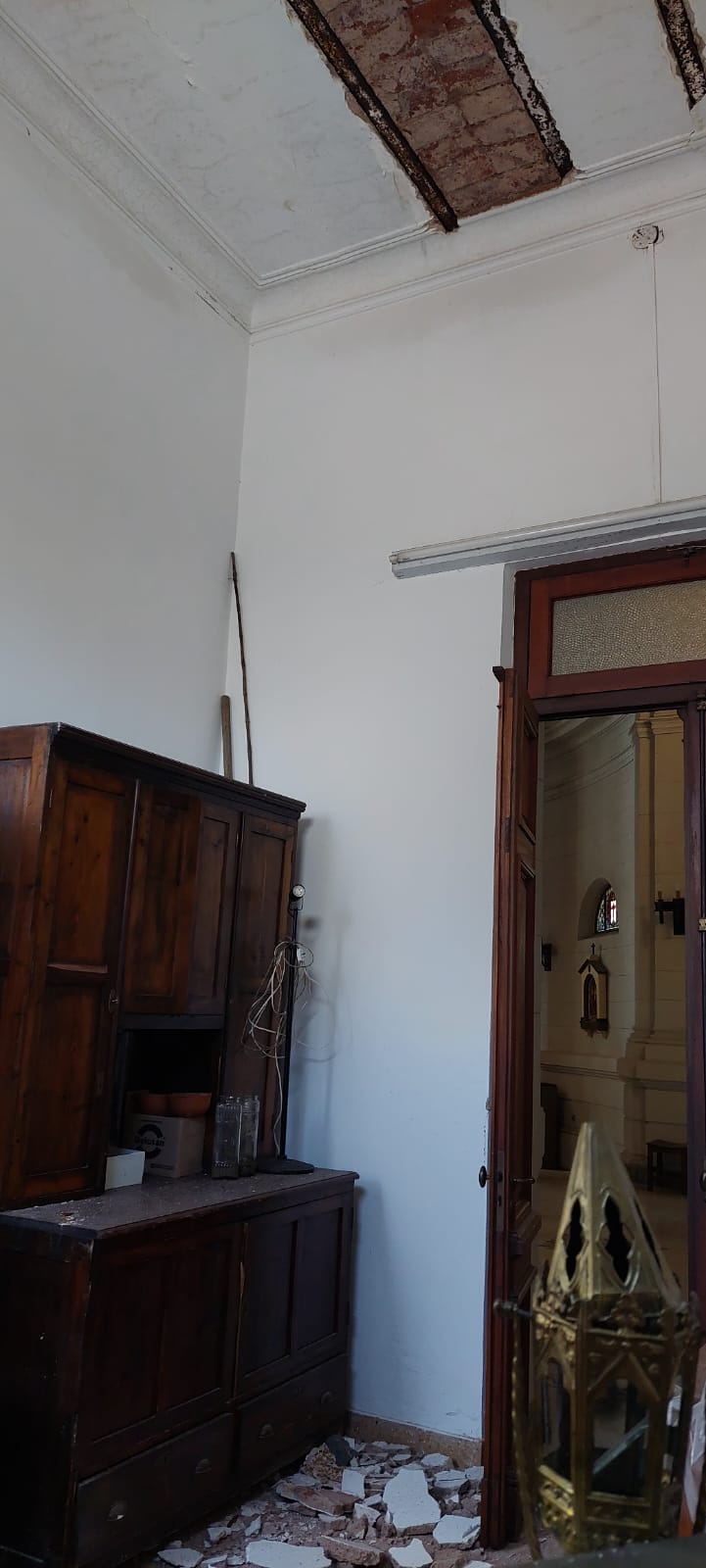 El propio Padre Lisandro, lo hizo público; «El pasado domingo 20 de Octubre, amanecimos con la mala noticia del desprendimiento de parte de la mampostería del cielorraso de la contrasacriatía».