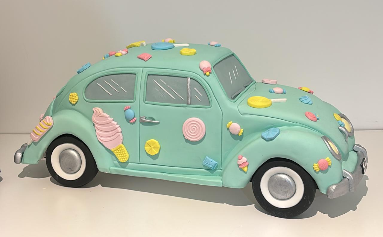 Se trata de una torta tallada a gran escala que representa un Volkswagen Escarabajo, con detalles realistas y una estructura pensada para ser compartida con el público durante el evento.