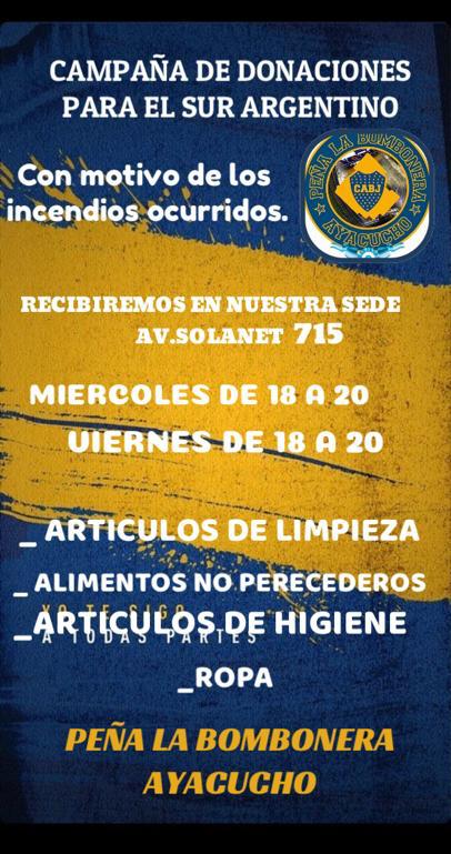Desde Peña La Bombonera, se informa por este medio que esta semana, Martes de 18 a 20 hs y Miércoles (feriado) de 10 a 13 hs se seguirá recibiendo donaciones para los afectados de los incendios del sur Argentino, en su sede ubicada en Av. Solanet N°715, casi Almafuerte.