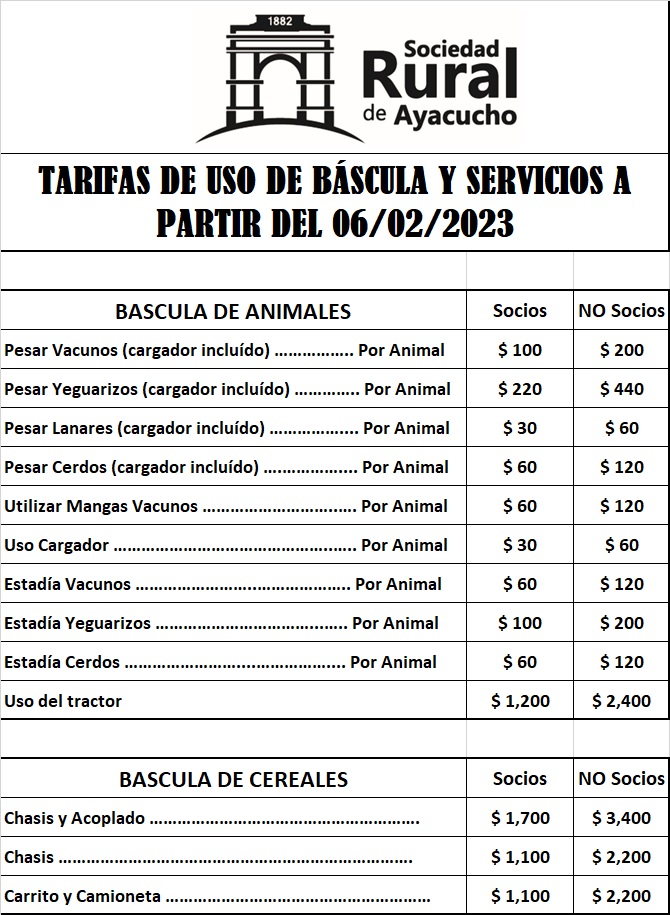 A partir de este lunes 6 de Febrero, comenzaron a regir estas tarifas para el usa de la báscula y servicios en el predio ferial.