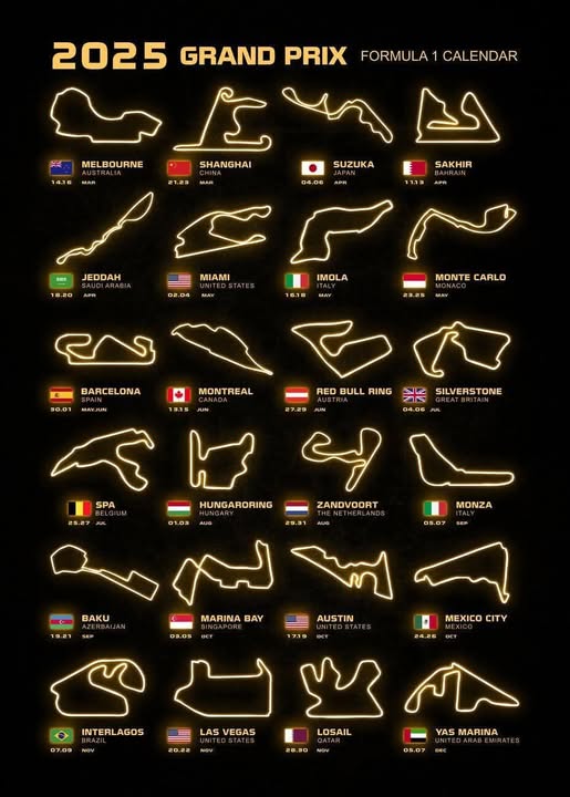 La temporada 2025 de la Fórmula 1, el campeonato de automovilismo más importante del mundo, ya tiene su calendario confirmado. Y no hay grandes novedades, ya que serán los mismos 24 Grandes Premios del 2024, con una pequeña diferencia en el orden de las primeras cinco jornadas. El Mundial comenzará en Australia y no en Bahréin, y la segunda y tercera fecha serán en China y Japón en lugar de en Arabia Saudita y Australia; la cuarta, en tanto, será en Bahréin (en 2024 fue en Japón) y la quinta en Arabia Saudita (venía de ser en China). Además, se invierte el orden de los GP de España (fecha 9) y Canadá (fecha 10), y los de Bélgica (13) y Hungría (14).