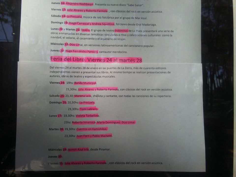 Pronto subimos más información de la feria del libro Todos los espectáculos -excepto 24, 25, 26, 27, y 28 de enero- son a las 23:30».