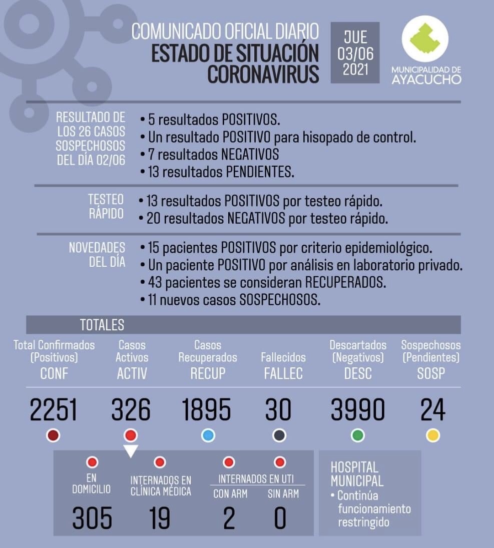 Este jueves se registraron 34 nuevos positivos de Covid y como también se dieron 43 recuperados, los activos son 326. De ese total, 21 se encuentran internados en el Hospital Municipal.