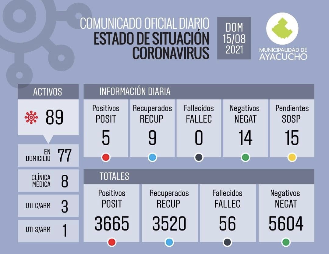 Este domingo 15 de Agosto se produjo una leve baja de casos activos de Covid, ya que se registraron 5 nuevos positivos y un total de 9 recuperados. Con estos datos, los activos son 89.