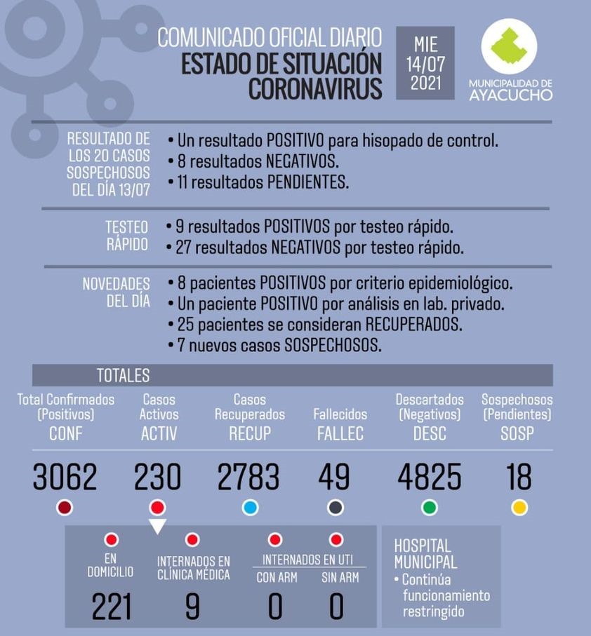 Leve descenso de casos positivos de Covid se registraron en Ayacucho en las últimas 24 horas. Un total de 19 nuevos positivos se dieron en tanto que hubo 25 recuperados.